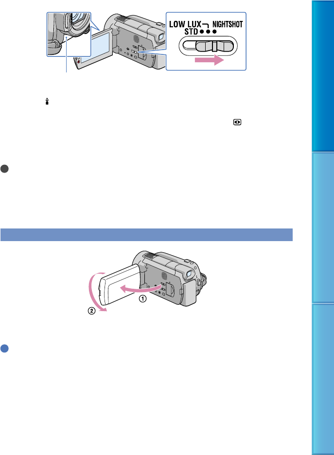 Open the LCD panel 90 degrees to the camcorder , then rotate it 180 degrees to the lens