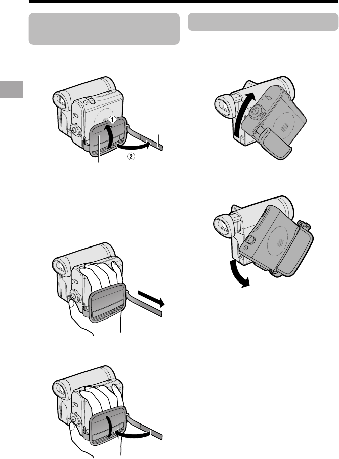 1 Open the hand strap flap (1) and grip