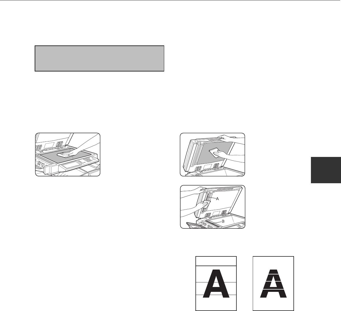 part of scanned images. These will show up as defects when the images are printed. Clean these areas by wiping them