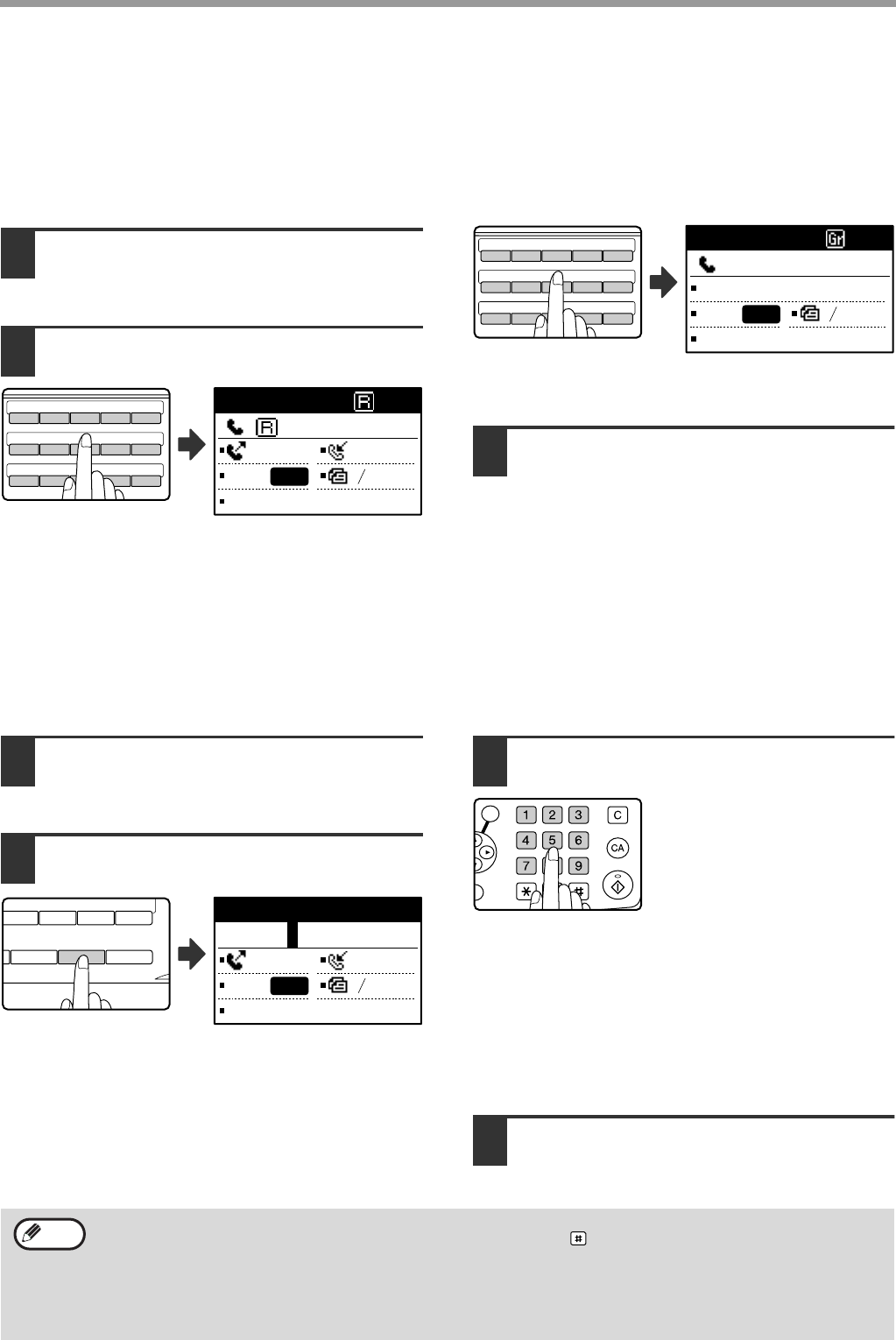 Fax numbers can be dialed by automatic dialing (Rapid dialing and group dialing) instead of pressing the numeric