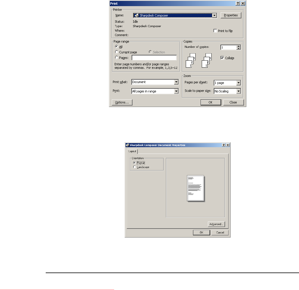 Select Sharpdesk Composer as the target printer. To change the document’s paper size or