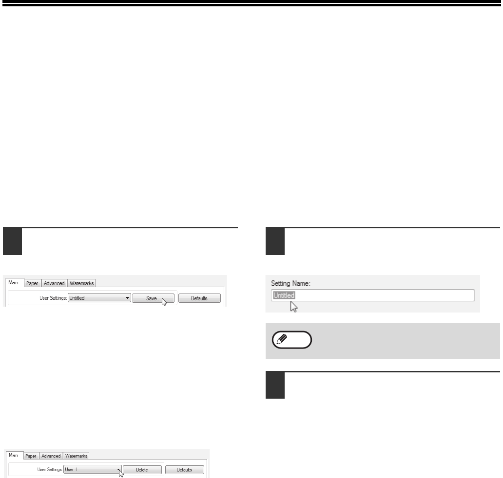 Settings configured on each of the tabs at the time of printing can be saved as user settings. Saving frequently used