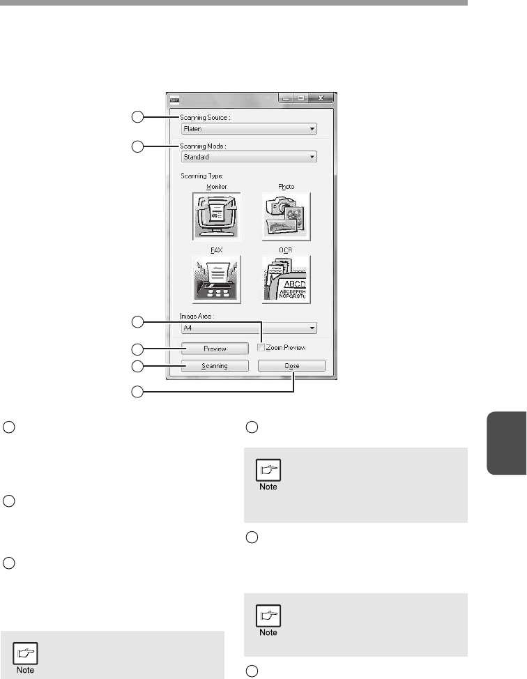 scan settings, and the "Preview screen", which shows the scanned image. For details