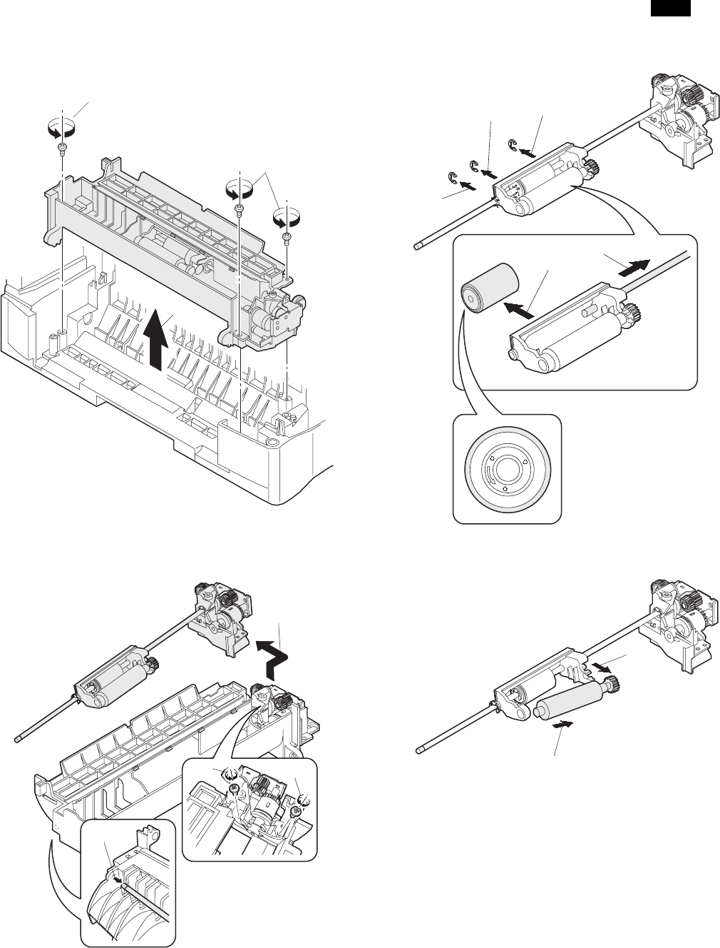 (5) Remove three E-rings and remove the manual paper feed roller.