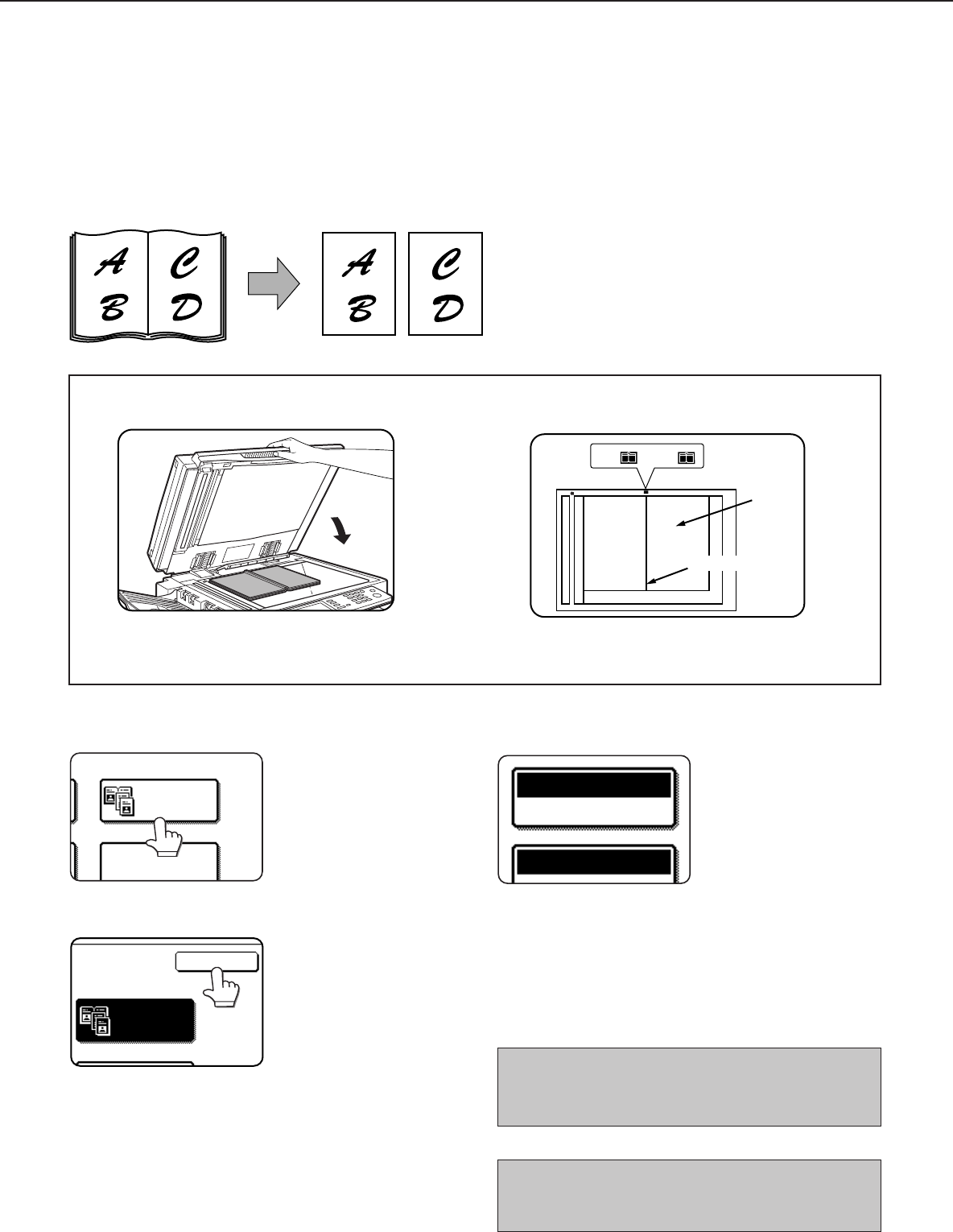 The dual page copy function produces separate copies of two documents placed side by side on the document glass.