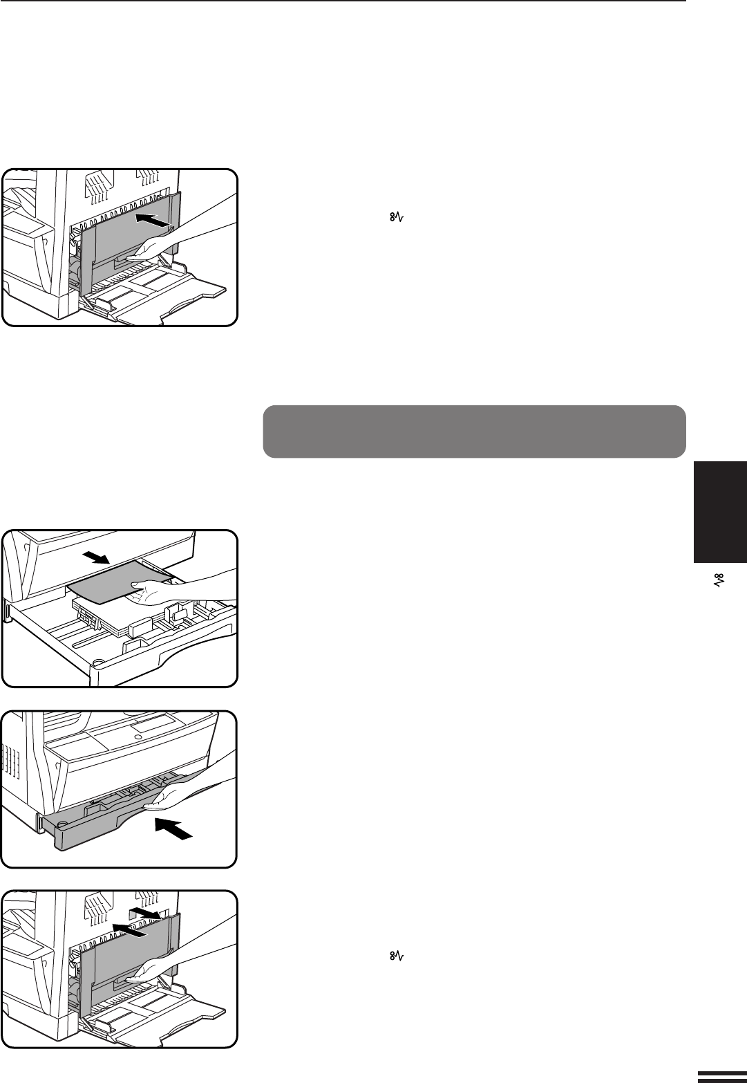 Before opening the paper tray, be sure to confirm that there is no misfed paper
