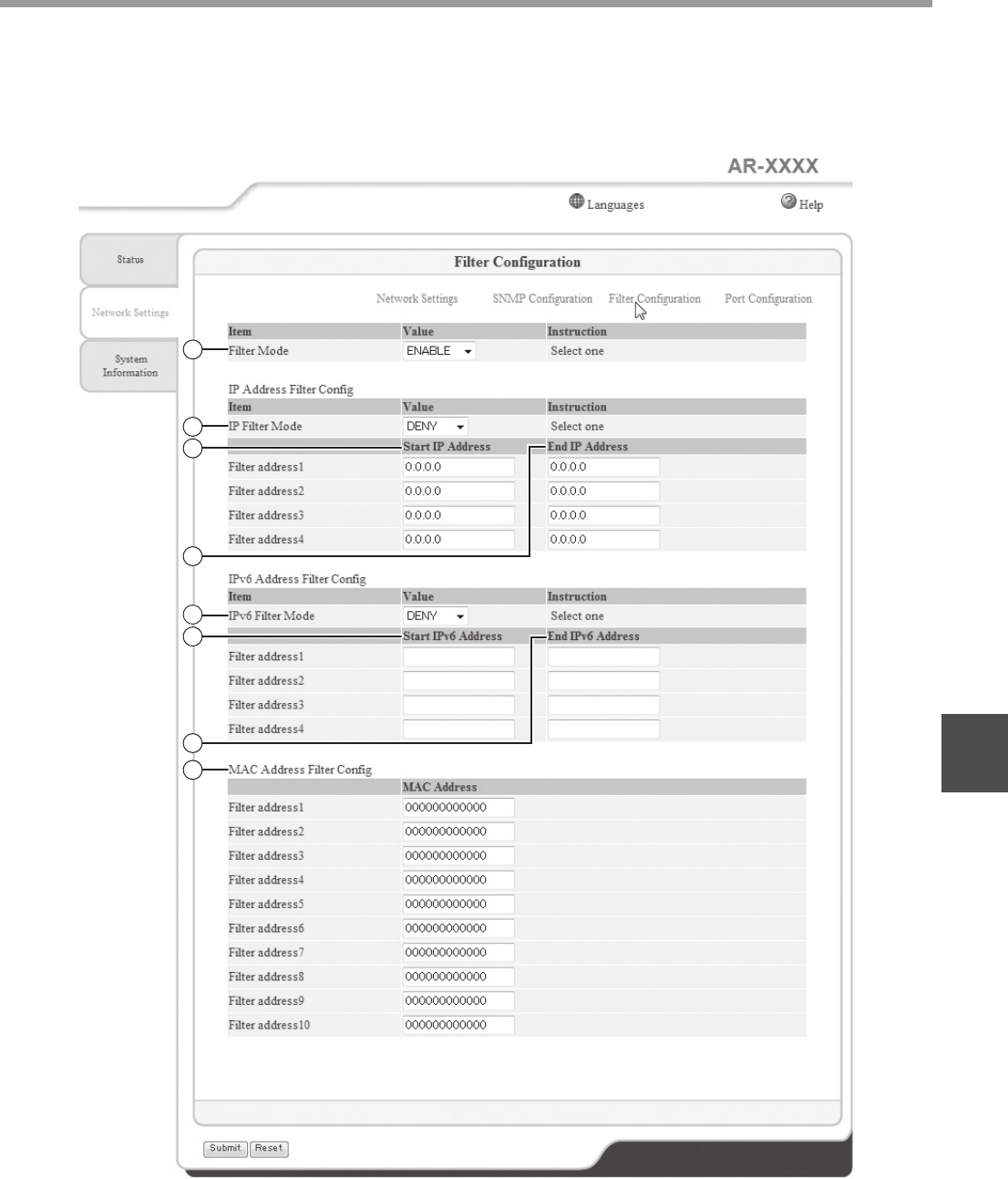 IP address filtering, IPv6 address filtering and MAC address filtering are available. Note that no filter is active by the