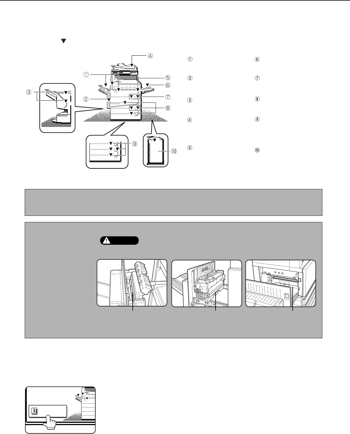 indicated by " " in the illustration below. The page numbers for detailed information for misfeed removal for each