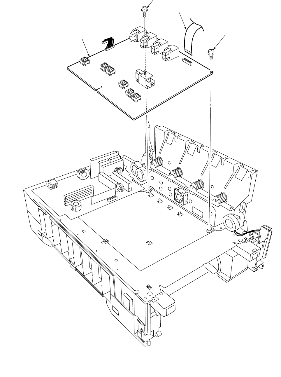 (3) Remove the two screws 2 to detach the high voltage power supply 1 and the tape harness 3.