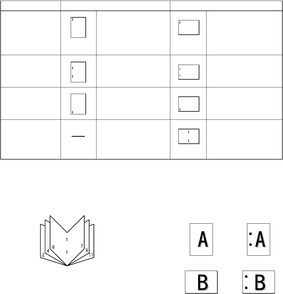 the saddle stitch tray (lower tray). The relation among stapling positions, orientation, paper size for stapling, and stapling capacity is shown below.