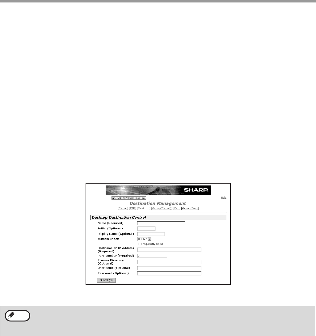 The following page for storing Scan to Desktop destination information appears when "Destination" is selected in the