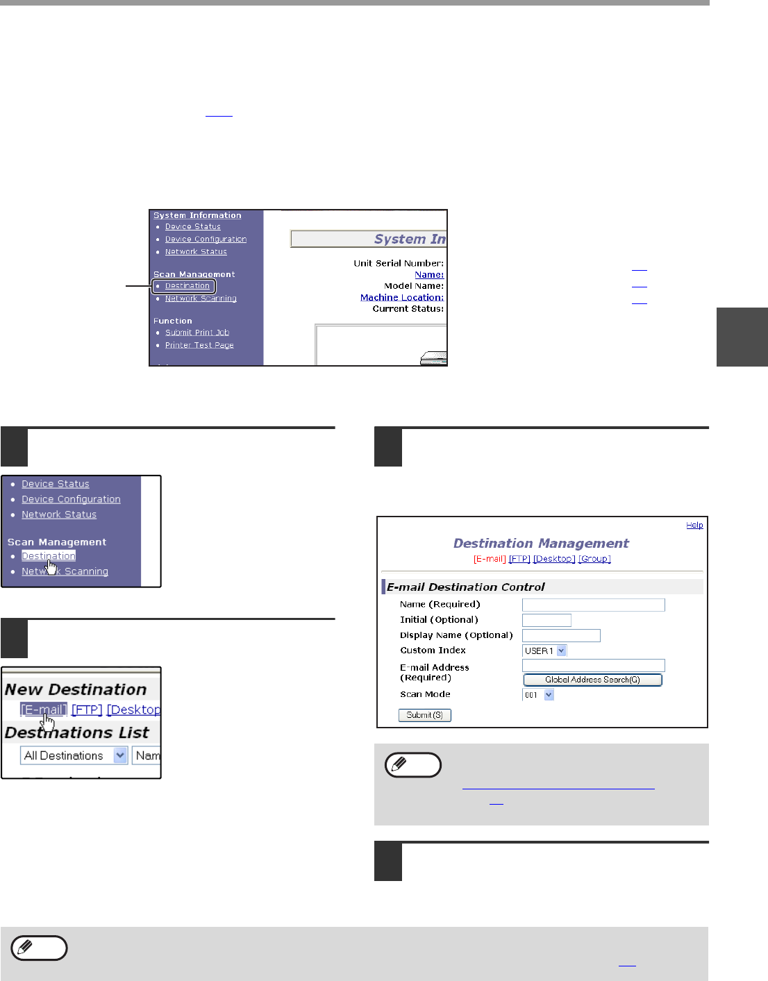 To store scanning destinations, click "Destination" in the Web page menu frame. "Destination" can also be used to