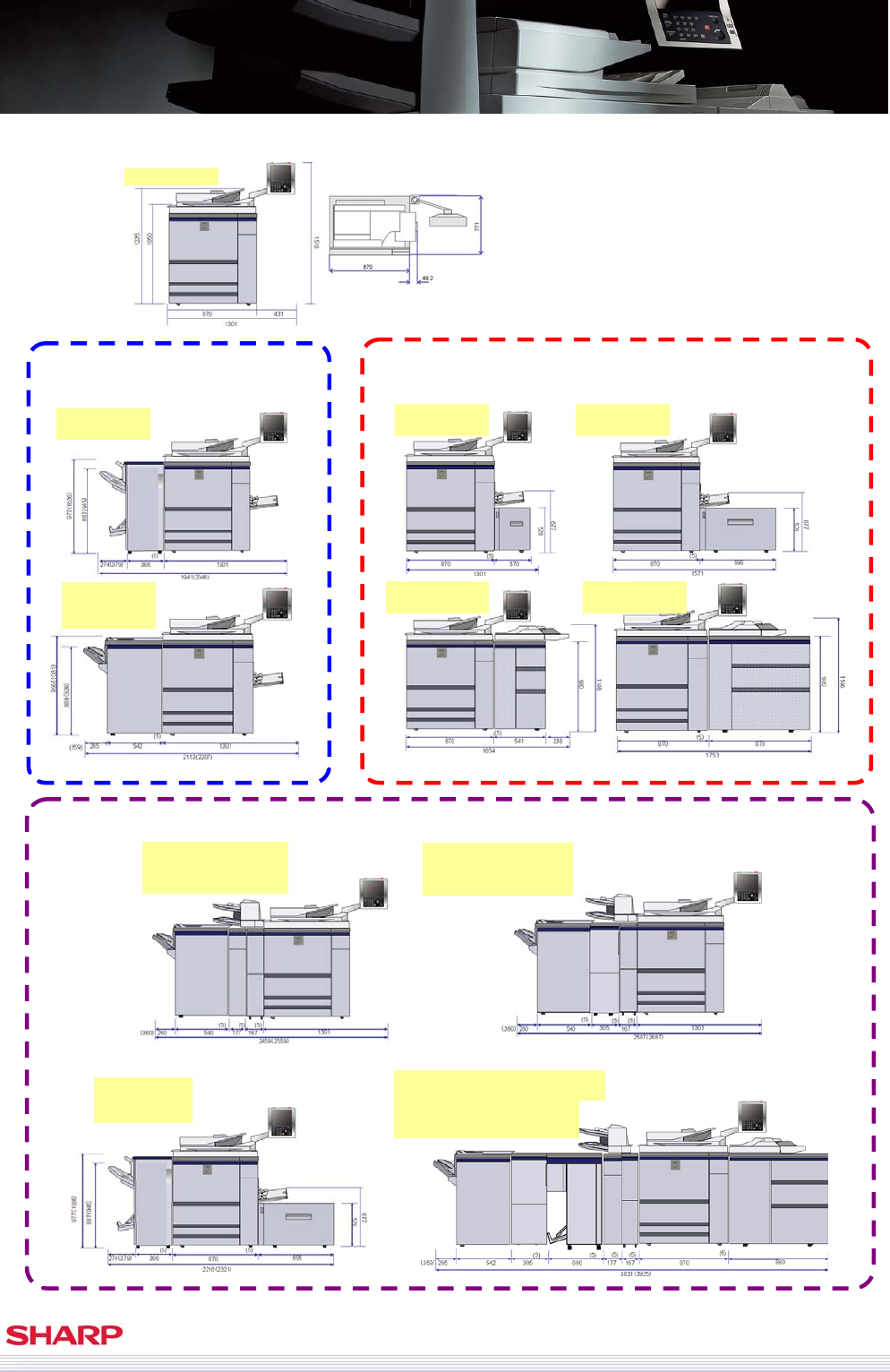 (Note: MX-M850/950/1100 requires at least one finishing option. Some diagrams without finishing option are only F.Y.I.)