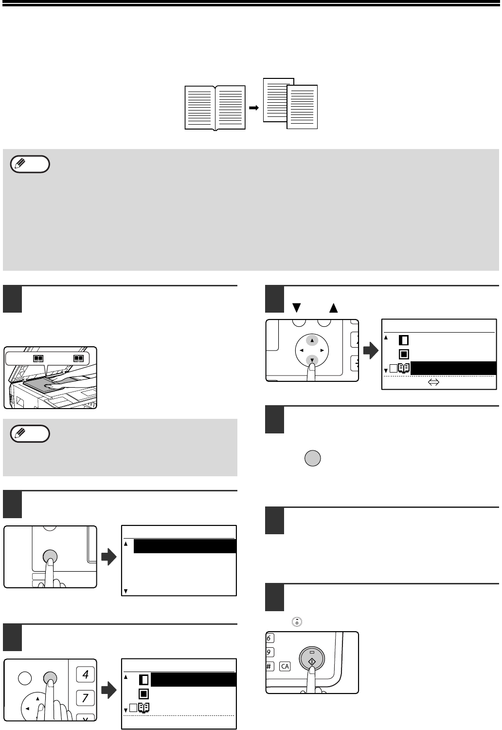 The dual page copy function produces separate copies of open bound original pages. This function is convenient