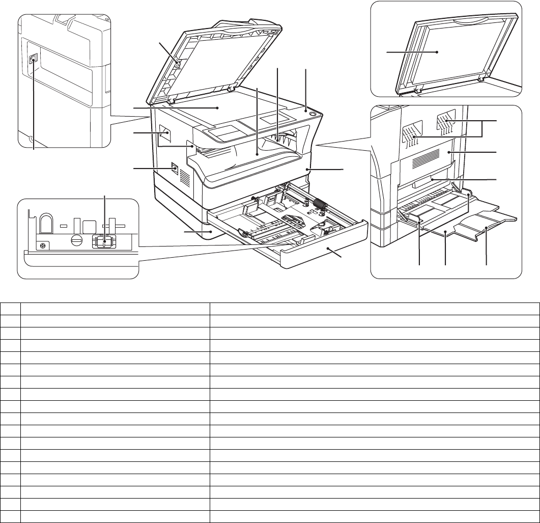 18 Bypass tray extension Pull out when feeding large paper such as A3 and B4 (11" x 17" and 8-1/2" x 14").