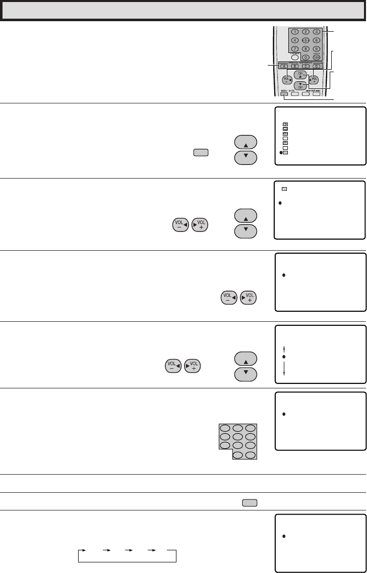 5 Press VOL k/l and CH a/s to move the “E” mark to the desired