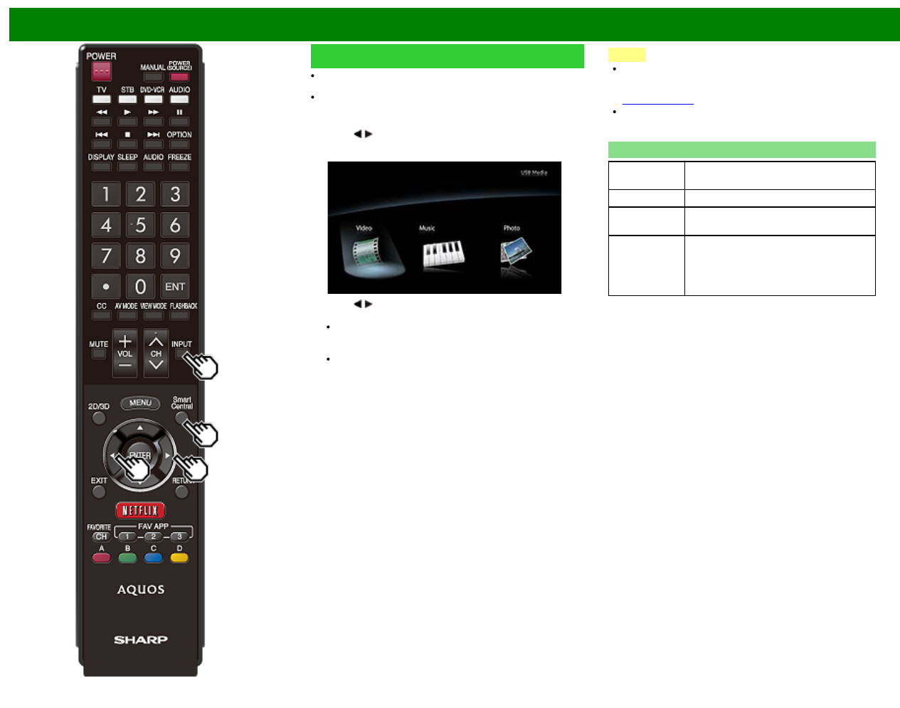 / to select "Photo", "Music" or "Video", and