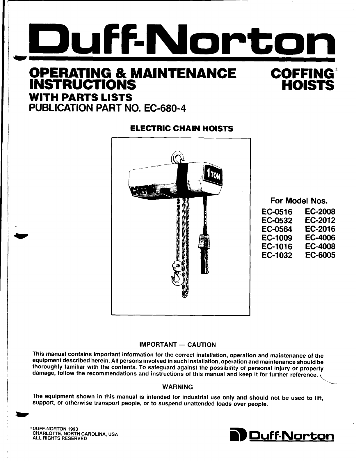 ElufF-Ncr-tcrnOPERATING & MAINTENANCEINSTRUGTIONSWITH PARTS LISTSPUBLICATION PART NO. EC.68O-4ELECTRIC CHAIN HOISTSIMPORTANT - CAUTIONThis manual