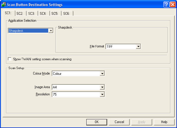♦ The SC1 tab (initially linked to Sharpdesk) is shown as an example.