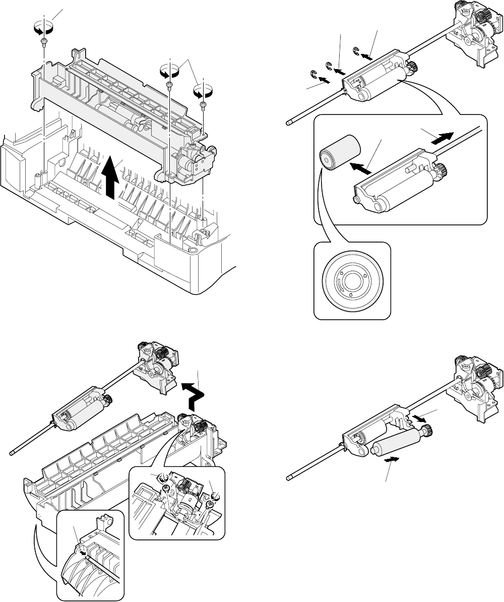 5) Remove three E-rings and remove the manual paper feed roller B9.