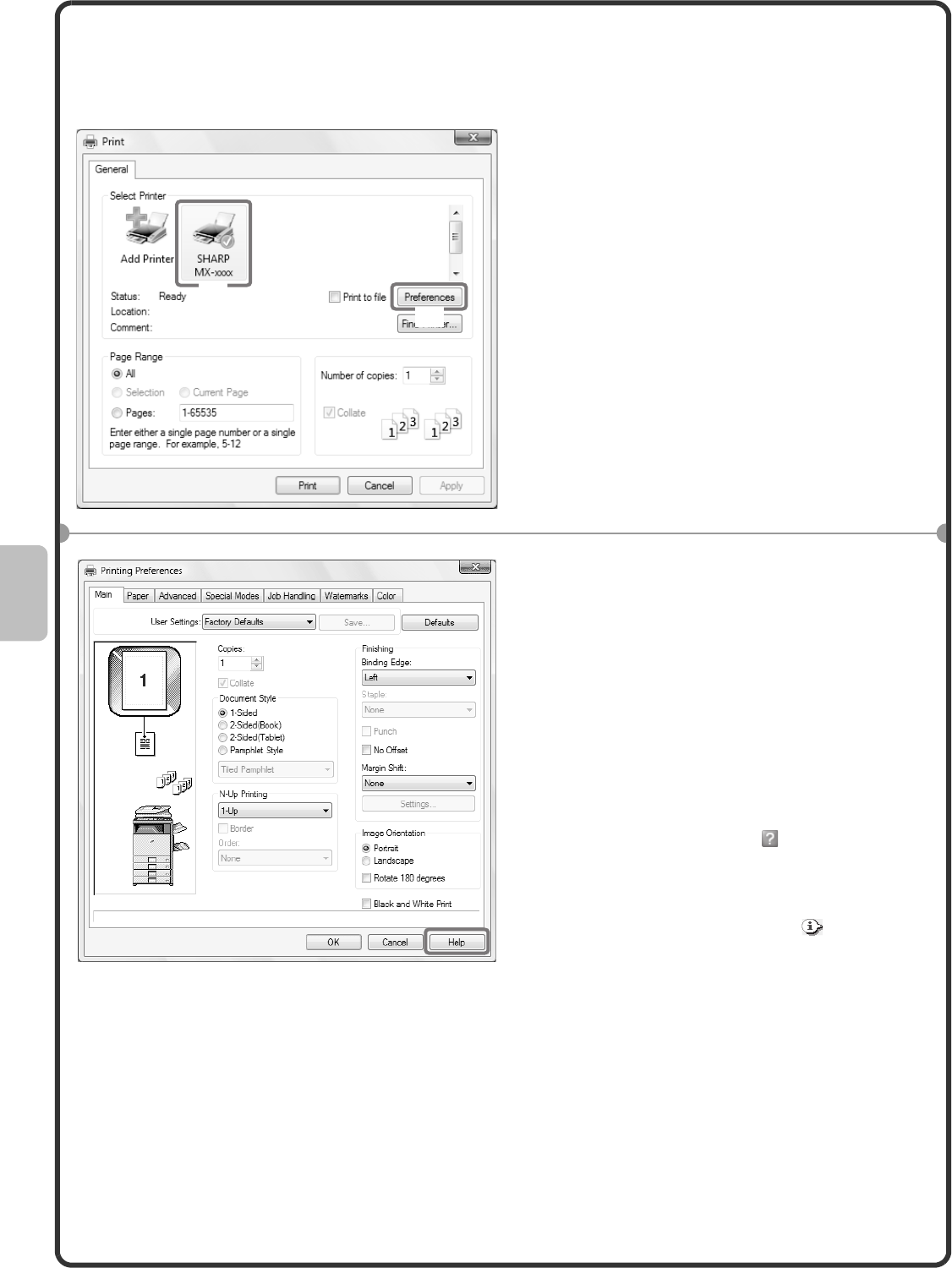 When selecting settings in the printer driver properties window, you can display Help to view explanations of the