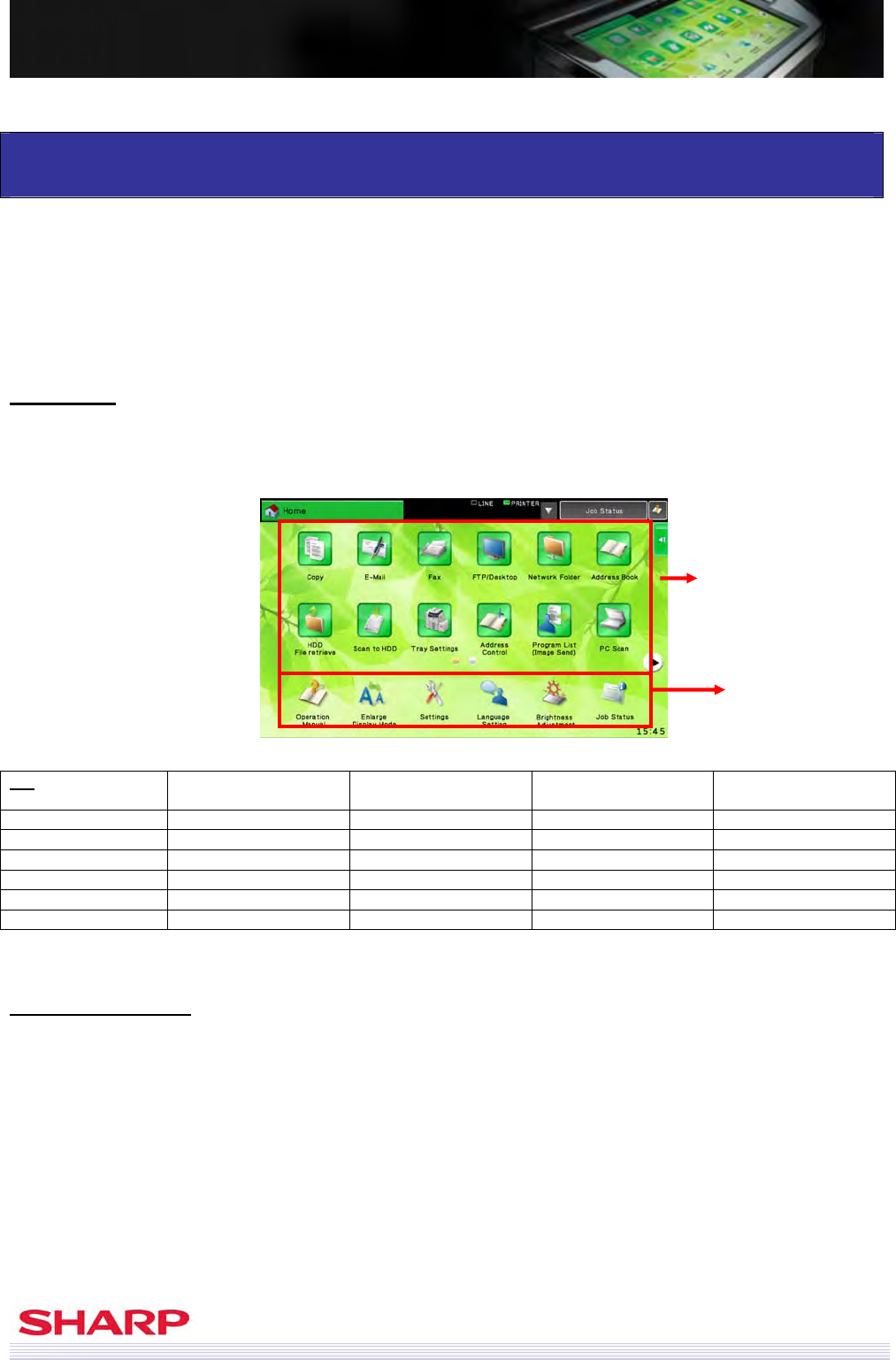 MX-5112N / MX-4112N have a Home screen with a choice of six different patterns. Basically the screen has two