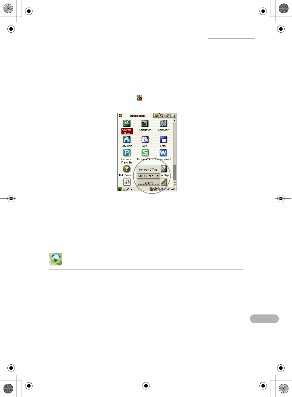 The Network & Sync application allows you to set up dial-up and LAN preferences,