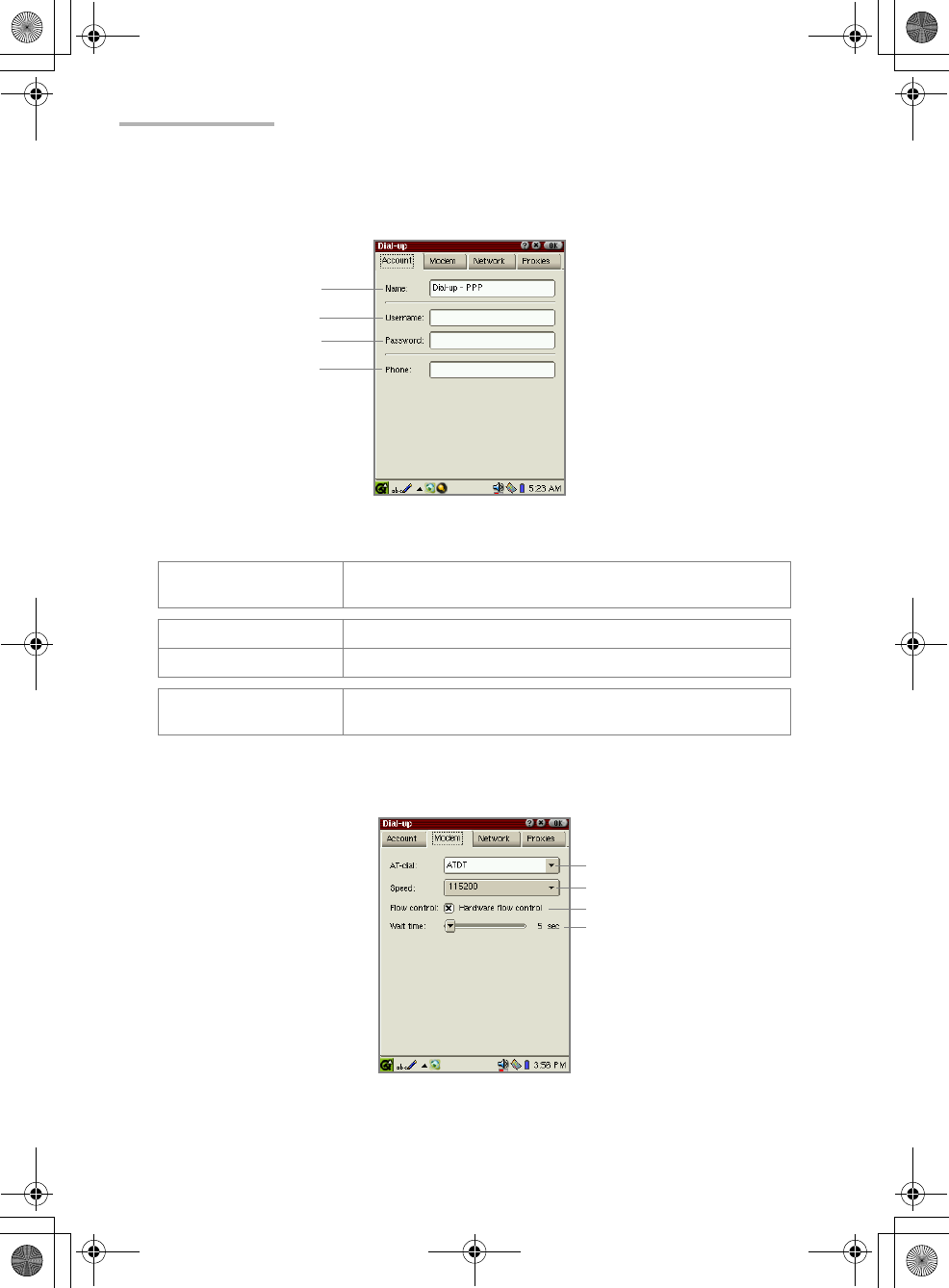 The Dial-up screen for modem options will be displayed.