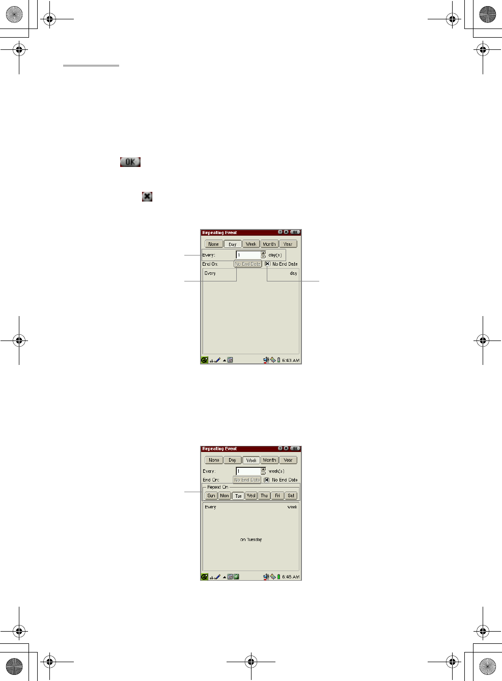 Tap the appropriate repetition button for the event, i.e. “Day”, “Week”, “Month”,