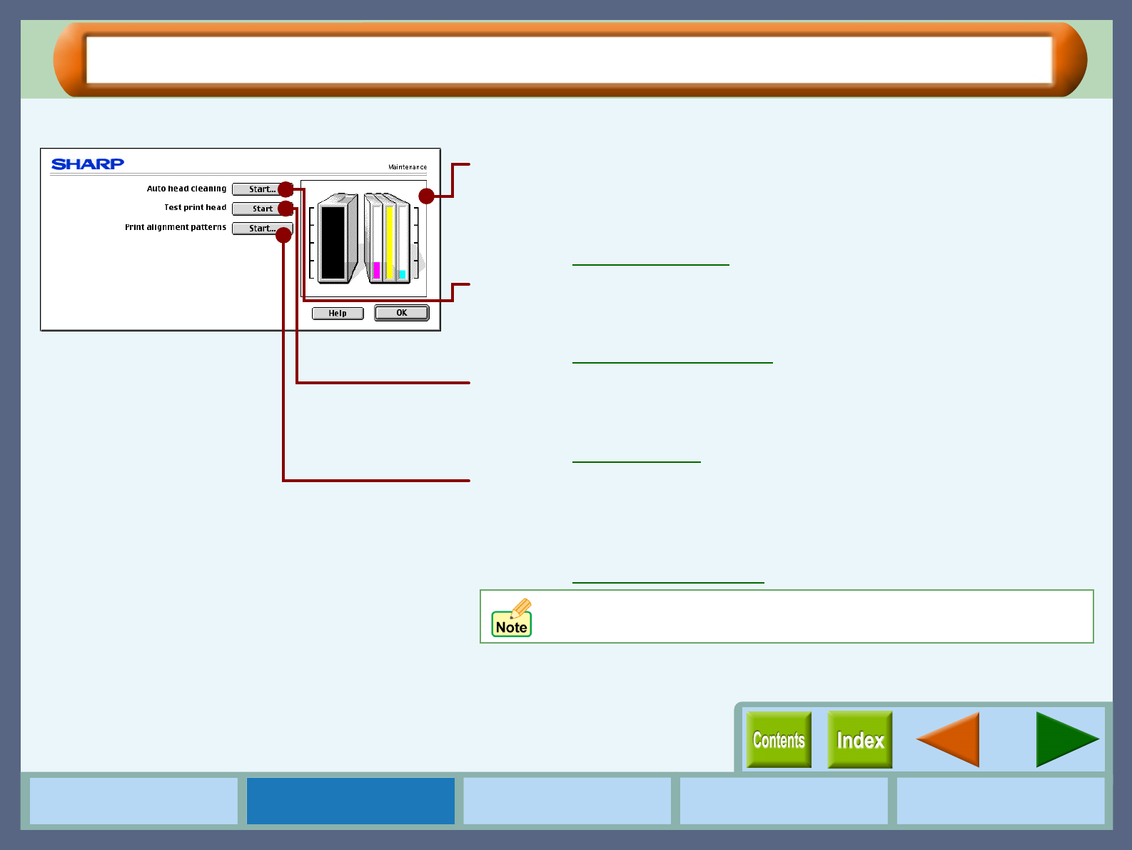 On this dialog box, you can control print head maintenance as well as check the amount of the remaining ink.