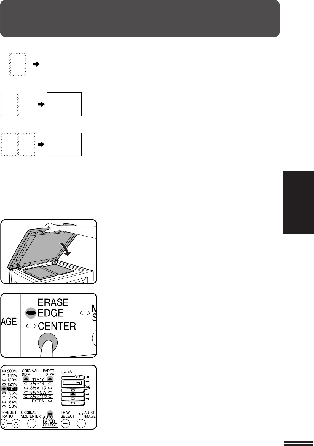 This copier has an edge erase mode and a center erase mode.
