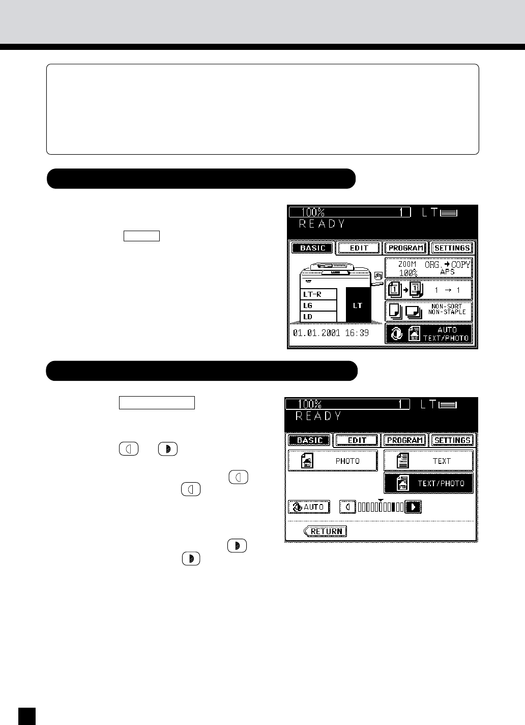 and illustrations. Originals with black areas and halftoned originals should be copied in the