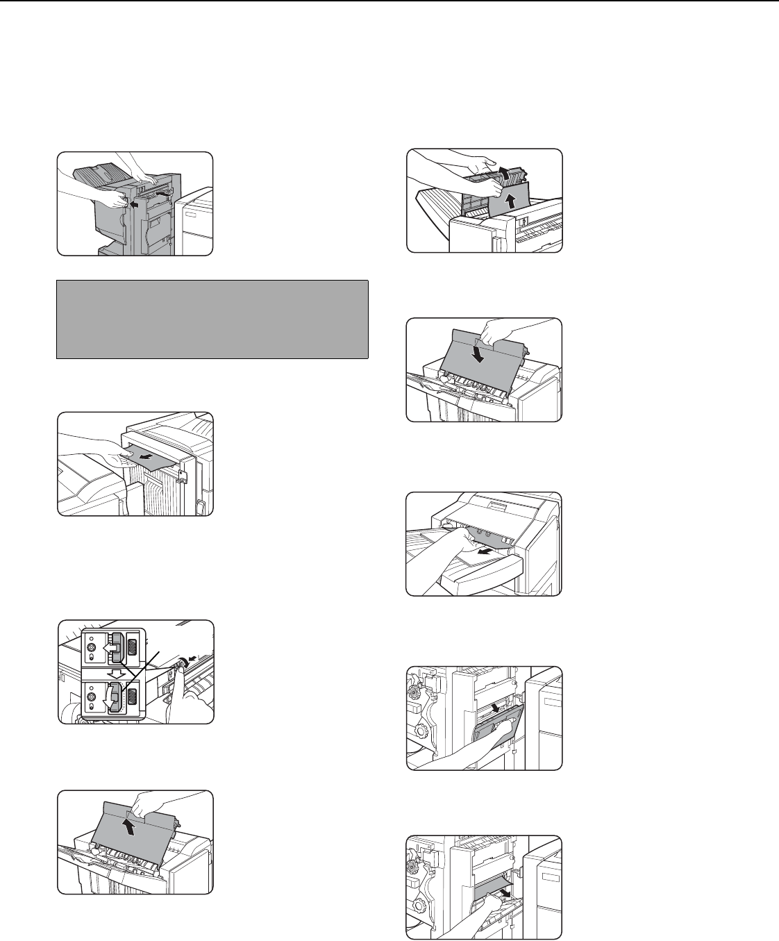 When a misfeed occurs in the saddle stitch finisher, remove the misfed paper following the procedure below.