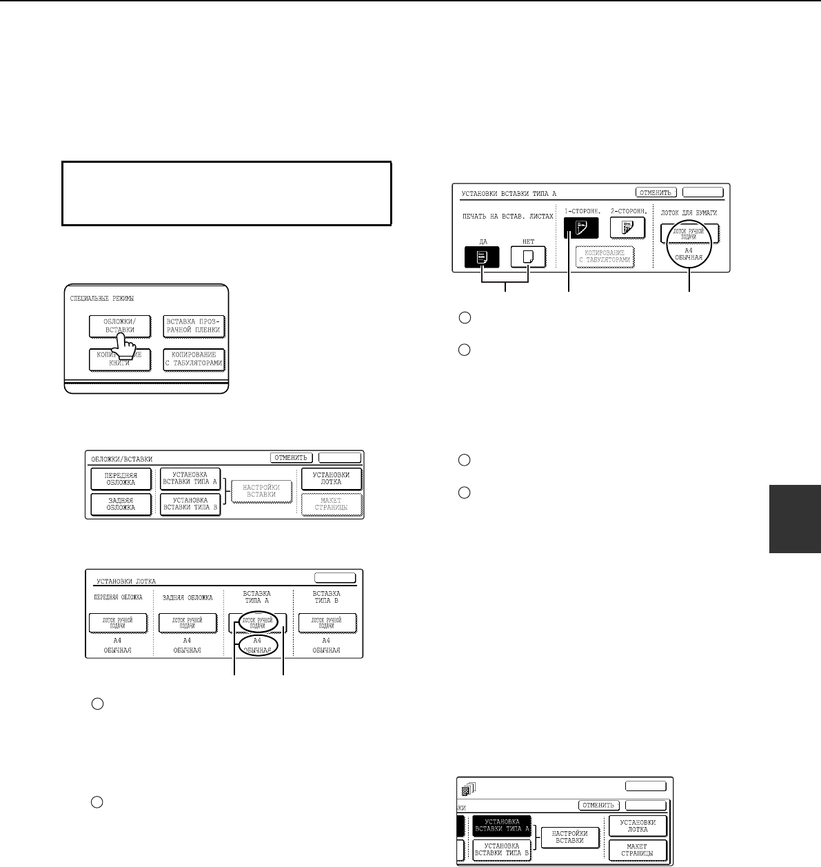 страницами. Использоваться может два типа бóмаãи. Они определяются с помощью êнопоê [Установêа вставêи типа А] и [Установêа