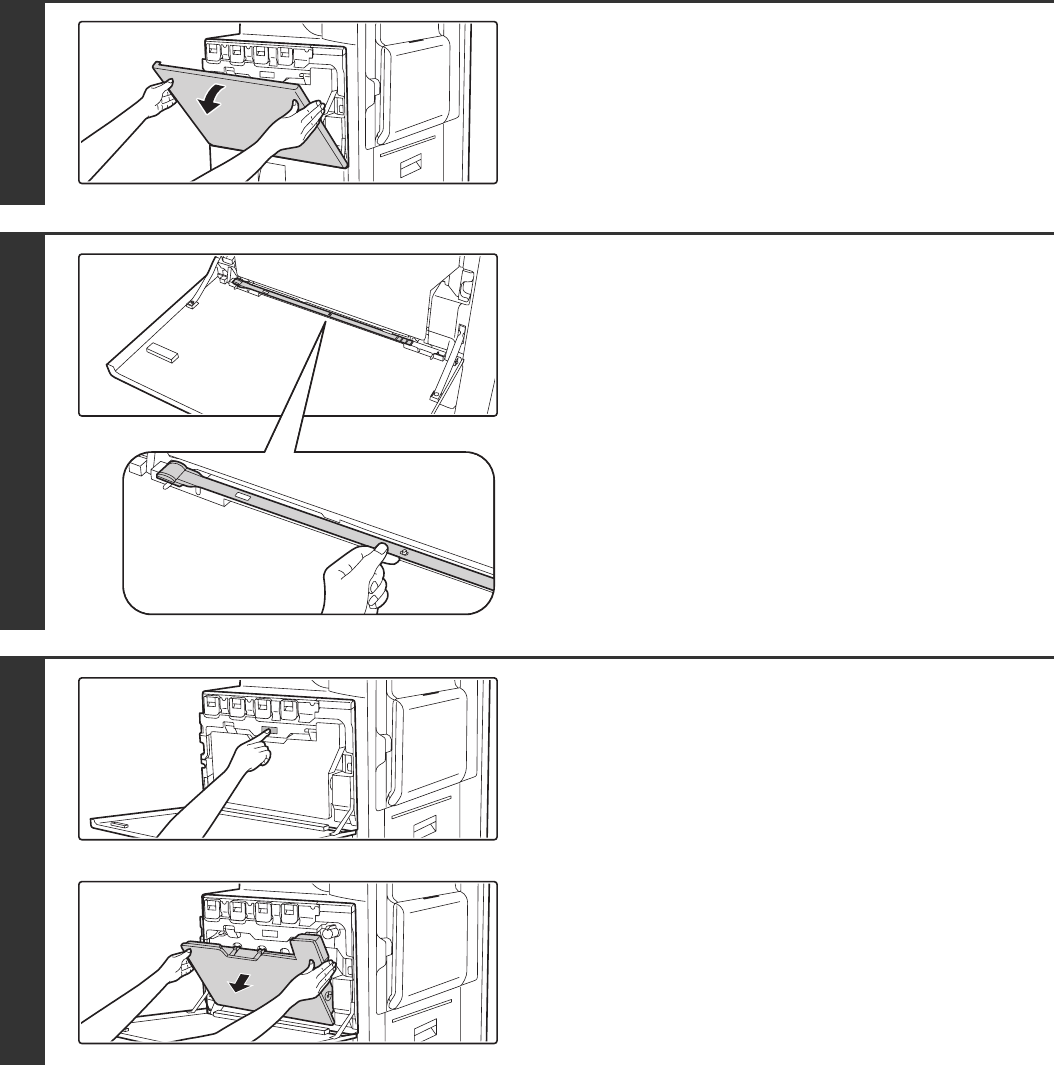 The waste toner box will fall forward as shown.