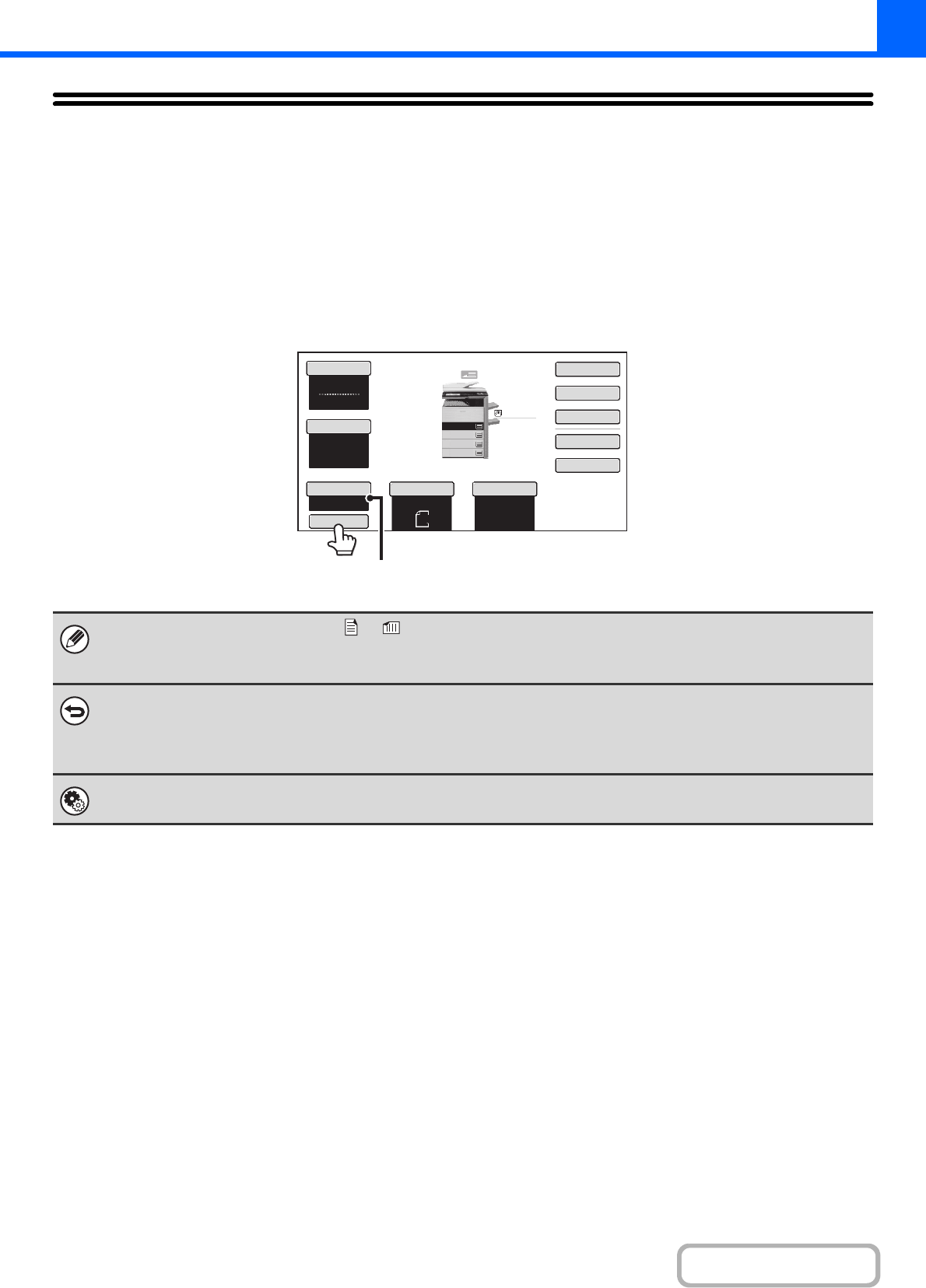 To return the ratio setting to 100%, touch the [Copy Ratio] key to display the ratio menu and then touch the [100%] key.