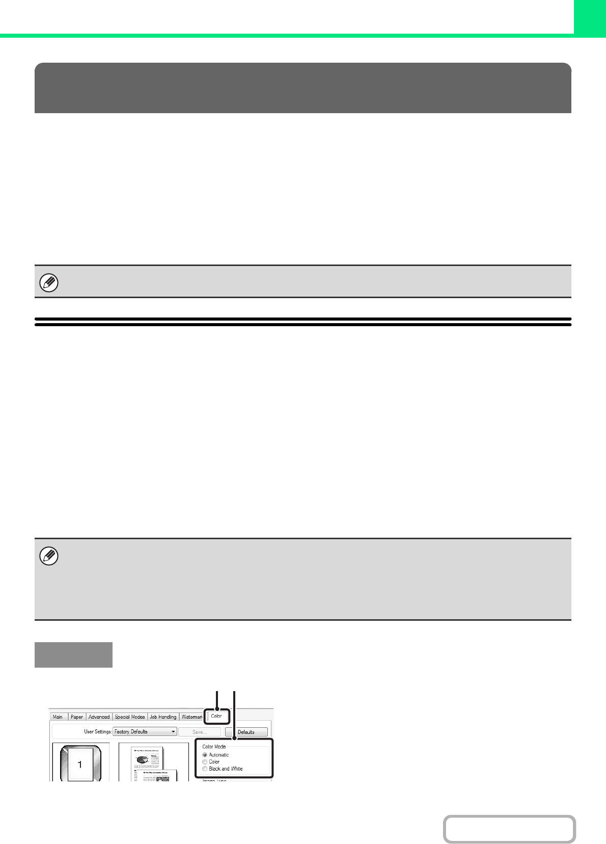 This section explains how to select the color mode in the printer driver properties window. The following three selections