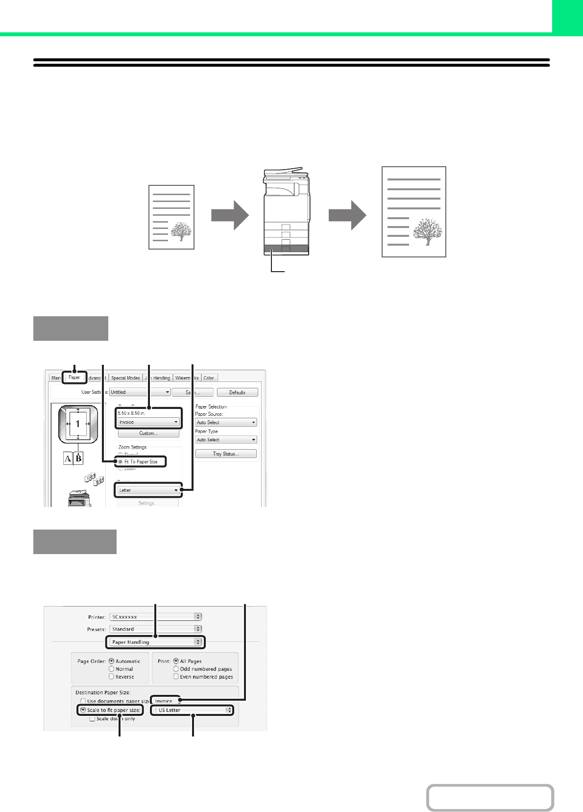 The following example explains how to print an invoice size document on letter size paper.