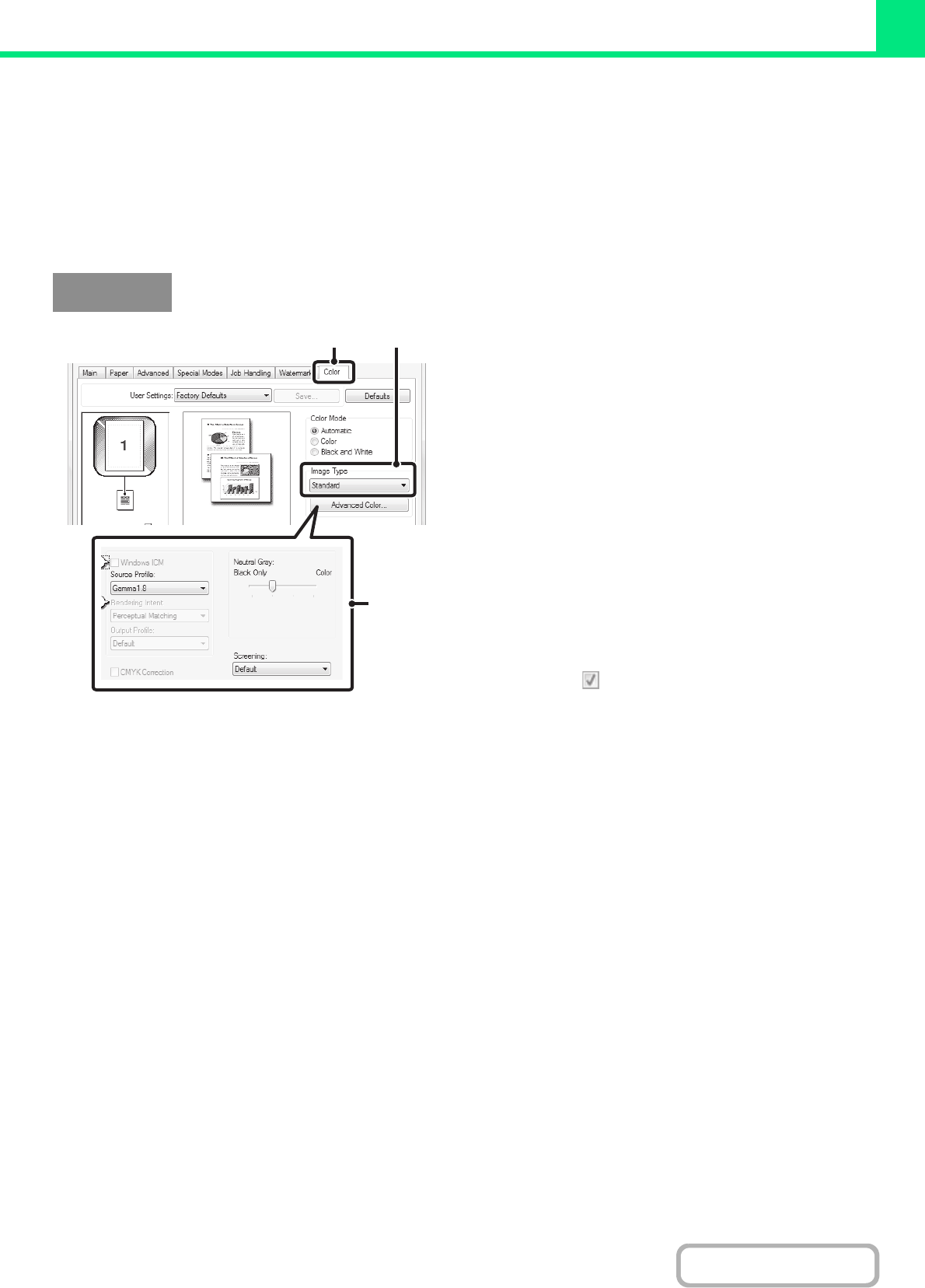 Advanced color settings can also be configured to match the objective of the color image, such as color management