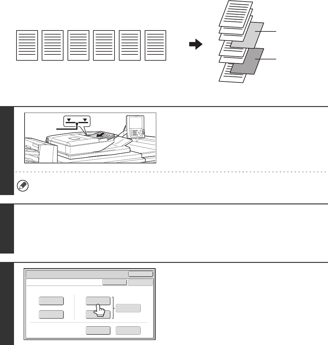 You can have different paper automatically inserted as inserts at specified pages of copies. Two types of paper can be