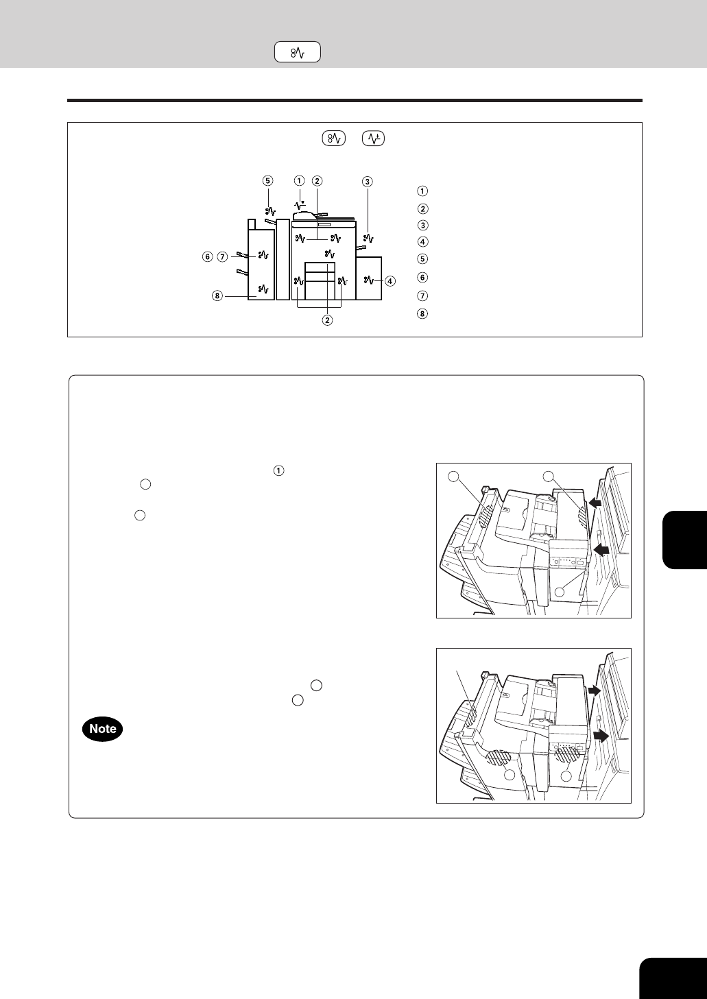 When a paper misfeed occurs in the copier,the or symbol flashes in the positions where the paper