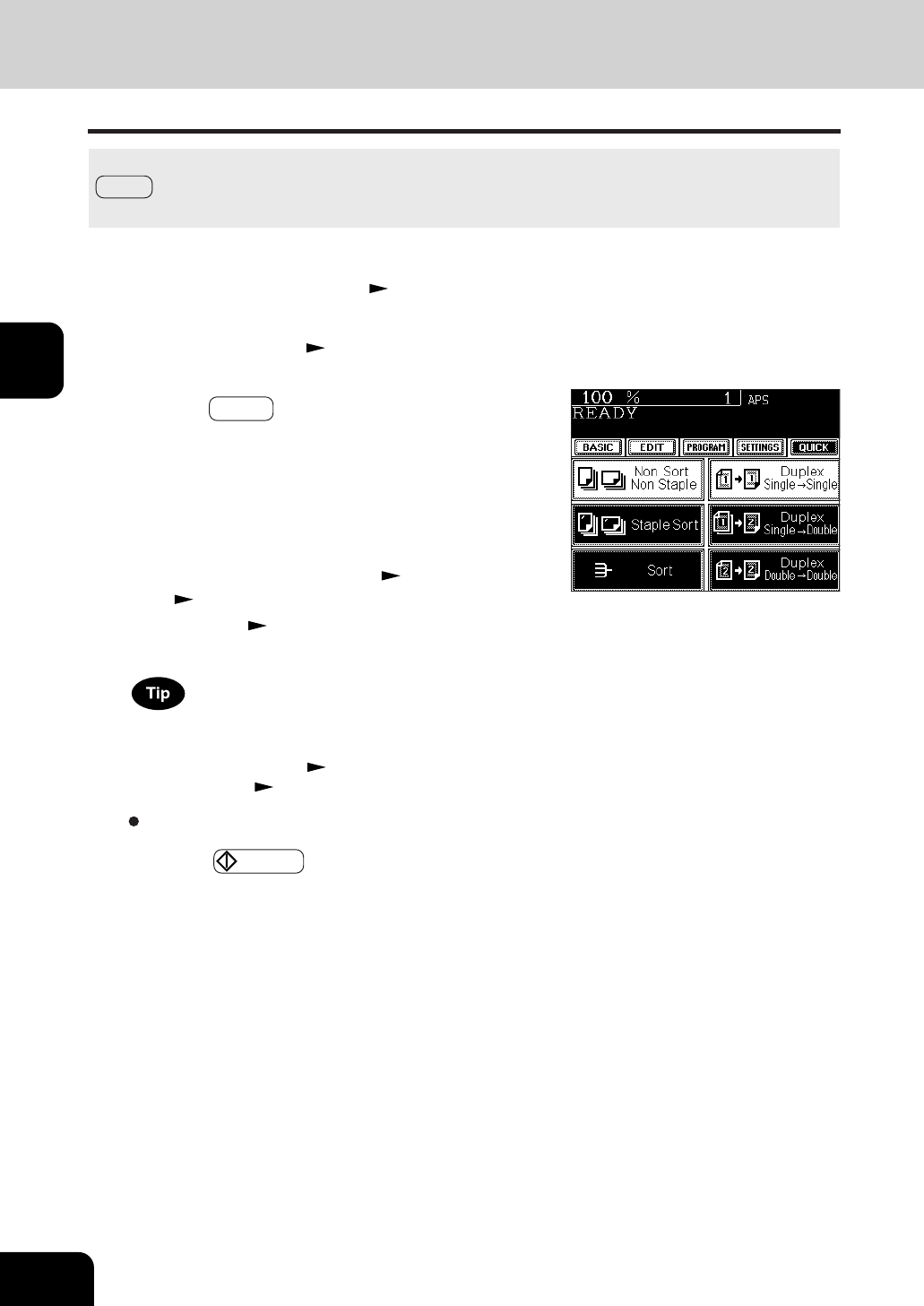 Finishing copy and duplex modes can be performed at the same time on one display by pressing the