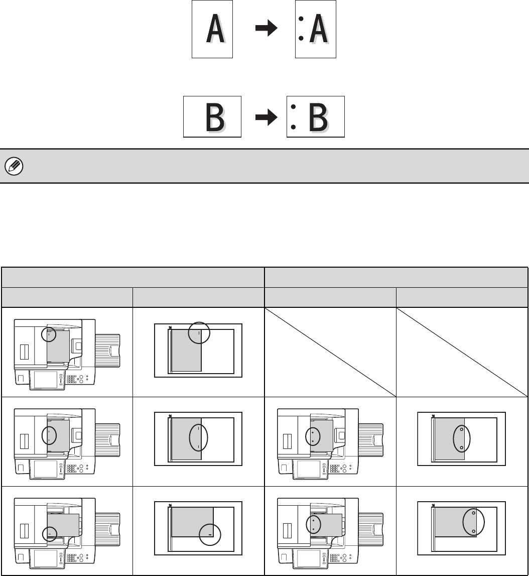 When using the staple sort function or the punch function, the original must be placed as shown below to enable stapling