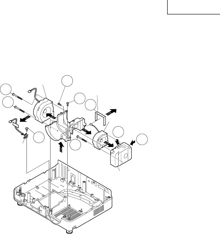 6-3. Remove a screw and two hooks. Detach the spacer B. Take out of the fan LCD R/G-intake duct B assembly.