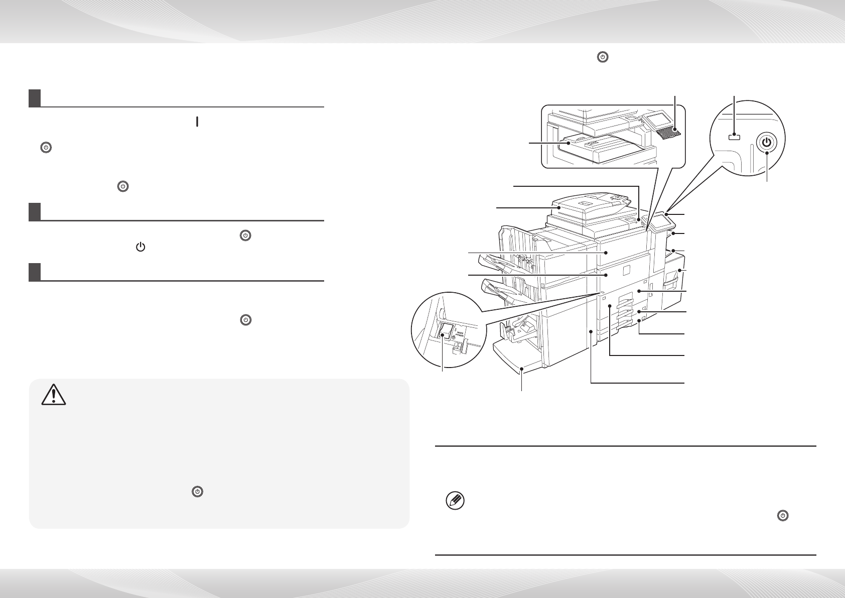 The machine has two power switches: The main power switch inside the front cover located in the lower left corner, and the [POWER] button ( ) on the operation panel.