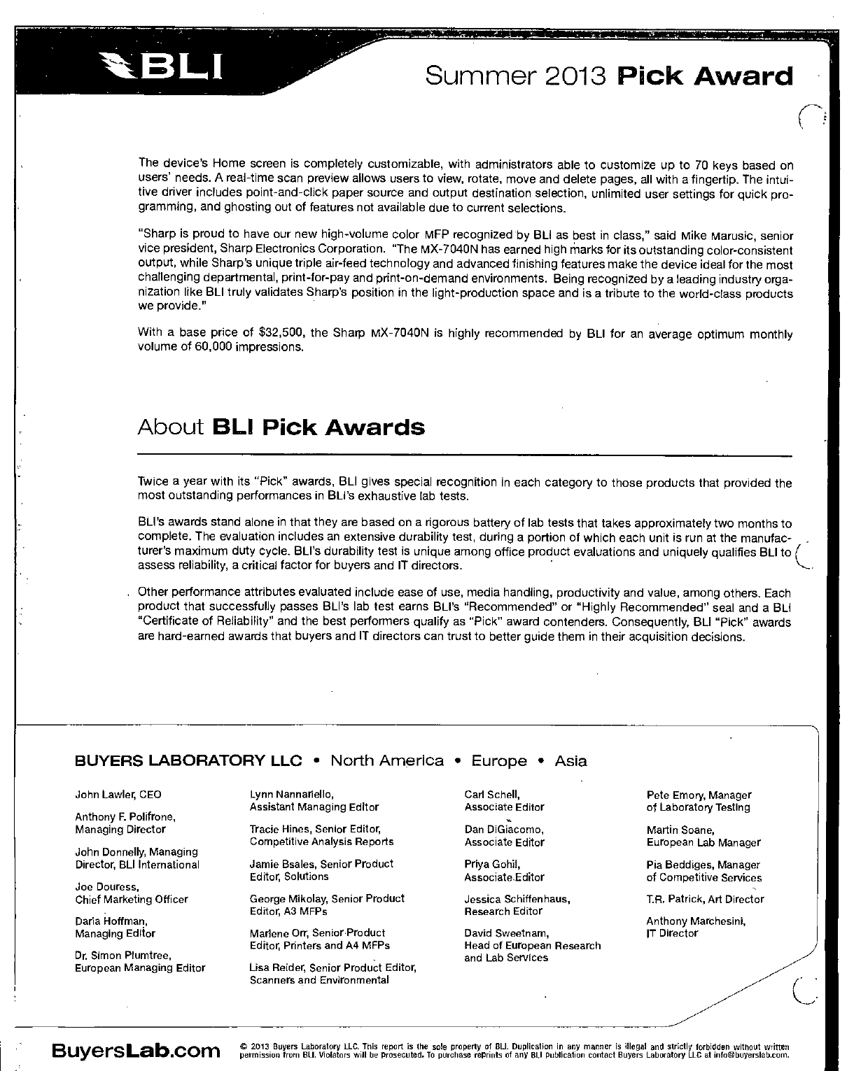 "Sharp is proud to have our new high-volume color MEP recognized by BLI as best in class," said Mike Marusic, senior