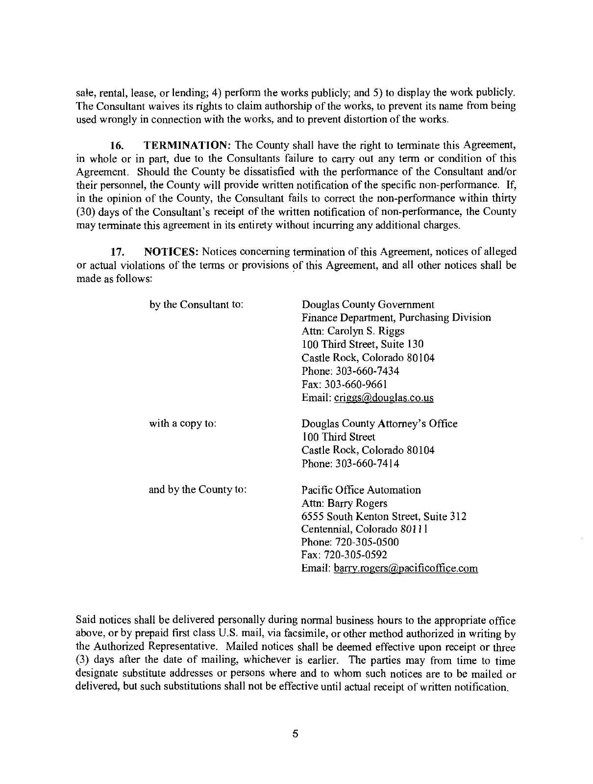 NOTICES: Notices concerning termination of this Agreement, notices of alleged