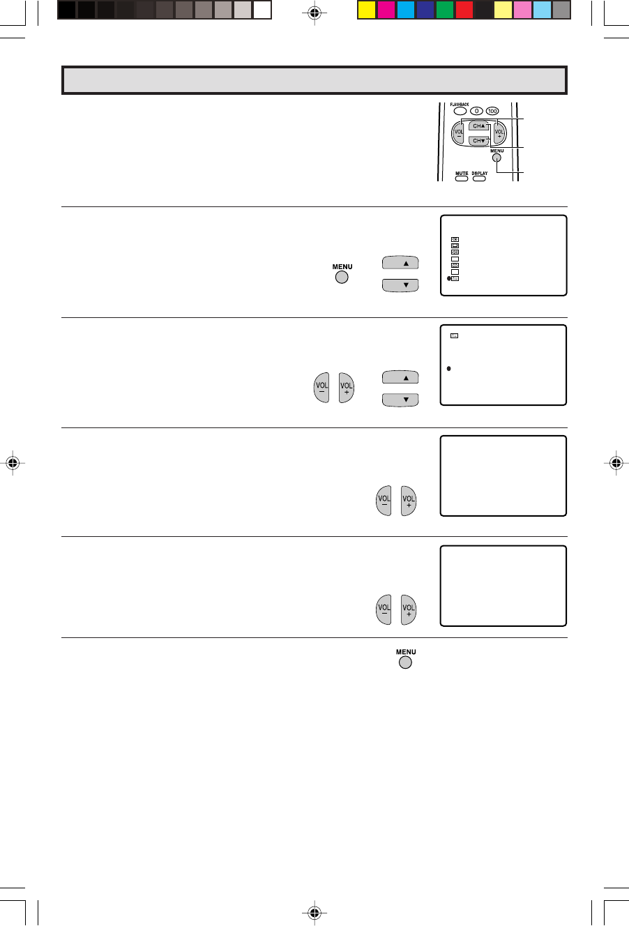 3 Press VOL +/– to access the SET UP screen, then press CH
